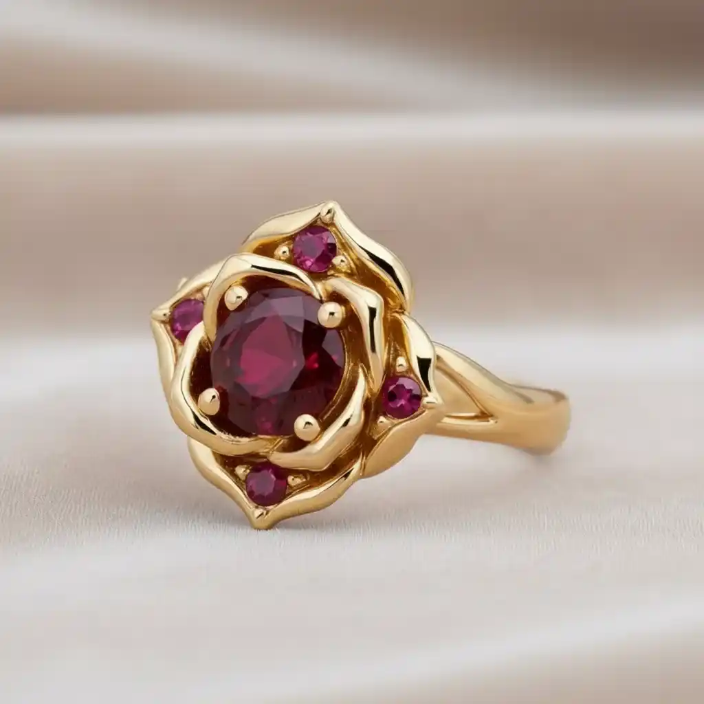 Mélyvörös gránát központja érett rózsaszirmot idéz e rózsa gyűrűben, apró gránátkövekkel gazdagítva, amelyek akár a virág életörömét sugározzák.